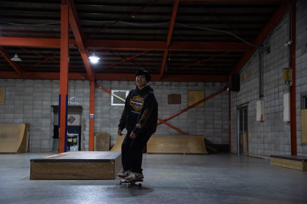 スケボー片手に